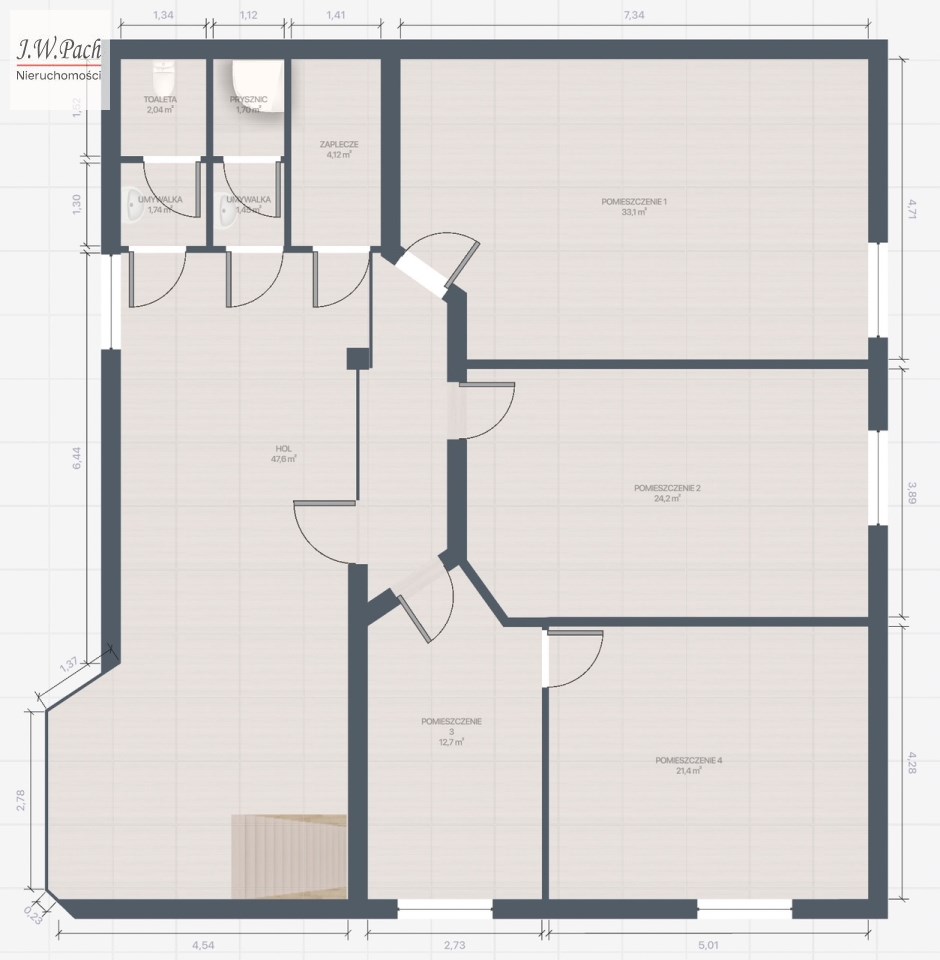 - 4 pomieszczenia biurowe (33,1 m² | 24,2 m² | 12,7 m² | 21,4 m²)